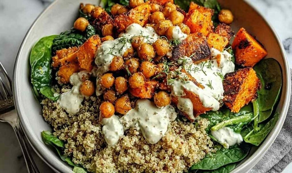 Step 5: Assemble the bowls. Divide the quinoa among four bowls. Top with the roasted sweet potatoes, sauteed chickpeas, and fresh spinach. Lay the sliced avocado on top and drizzle generously with the tahini yogurt sauce. Serve right away.