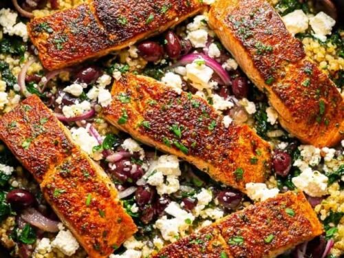 Step 6: Return the salmon to the skillet and cook for just 30 seconds to heat through. Sprinkle feta over the top if using, garnish with fresh parsley, and serve immediately.