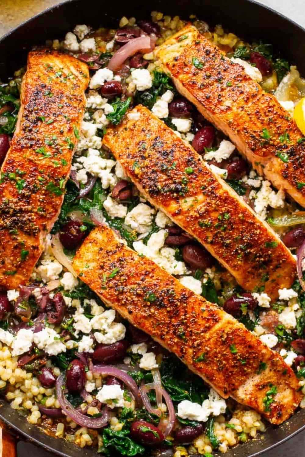 - Return salmon to the skillet and cook for 30 seconds to heat through. Sprinkle feta over top if using. Garnish with fresh parsley and serve immediately.
