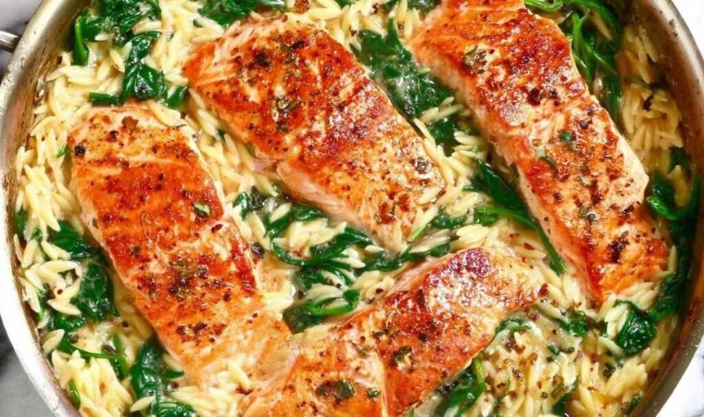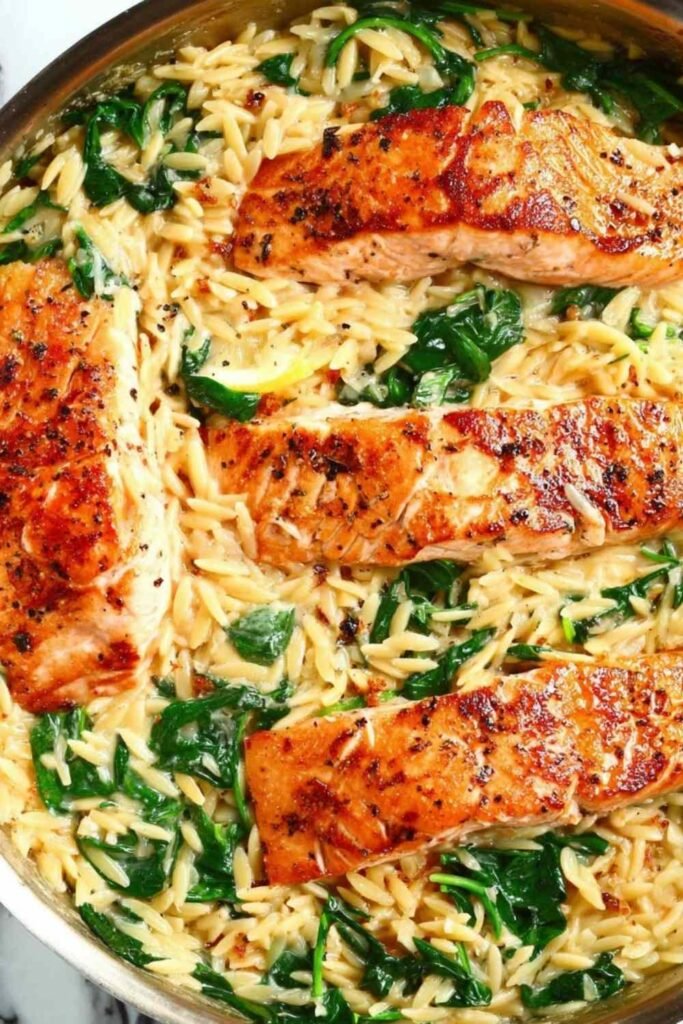 Roasted Asparagus or Broccoli: Light and slightly bitter greens balance the richness of the salmon and the creamy orzo perfectly. If you love garlic-roasted vegetables, these Roasted Potatoes with Baked Feta and Garlic make a hearty alternative worth bookmarking.